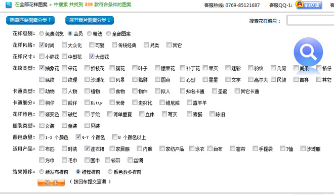 在‘會員匹裝圖案’里面找‘風(fēng)格時尚’、‘尺寸比例大’適合用于‘連衣裙’并且花樣顏色數(shù)在‘4-7’個之間的‘抽象花’,結(jié)果按‘推薦程度’降序來排序。