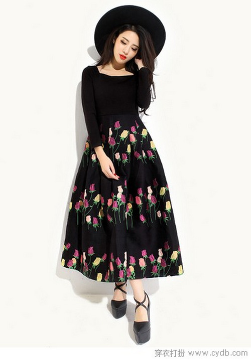 也許你比較偏向純色的素雅,而我卻喜歡推薦印花裙的獨特。大裙擺上的花朵,讓純黑色都變得饒有趣味,也許更適合你的毛呢大衣哦。