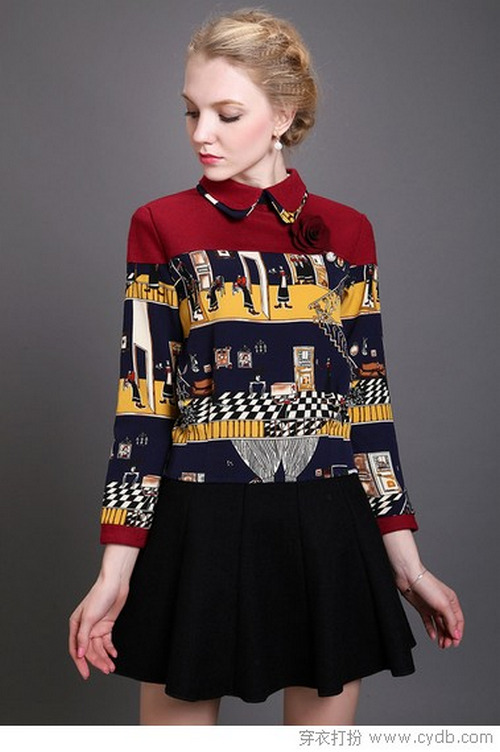 最后再更新一款印花打底衫吧,把客廳的景象都印染下來,不按規(guī)矩出牌卻讓人覺得很是親切。娃娃翻領(lǐng)年輕了好幾歲,色彩雖然鮮艷但也劃分出好幾個層次,搭配黑色傘裙效果不賴。