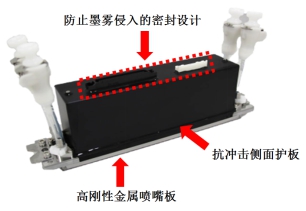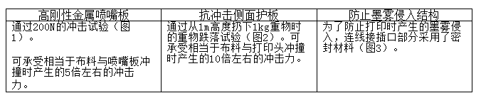 1. 通過采用高剛性金屬噴嘴板以及抗沖擊側(cè)面護(hù)板,提高了抵抗布料沖擊的能力。而且,防墨霧的構(gòu)造可以防止墨霧或者纖維侵入。