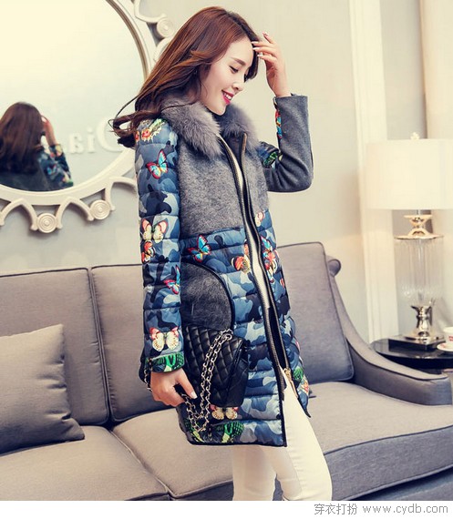 蝴蝶飛來了,落在了一直不起眼的羽絨服上,讓人覺得冬天不那么無聊。貂絨拼接,高級灰期待你的別樣演繹。迷彩印花的方式改變了色彩,藍(lán)色系似乎更加溫婉,與蝴蝶翩翩飛舞的情愫遙相呼應(yīng)。
