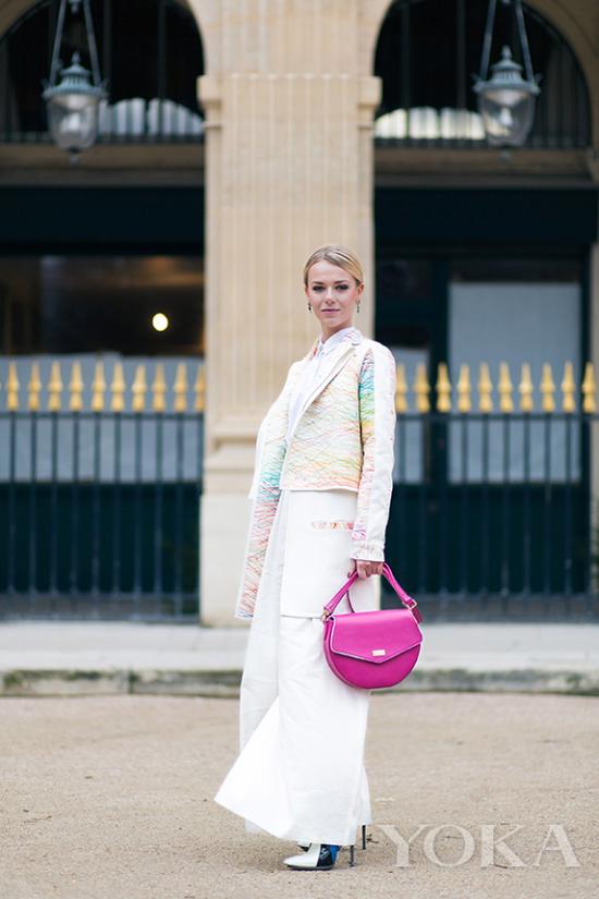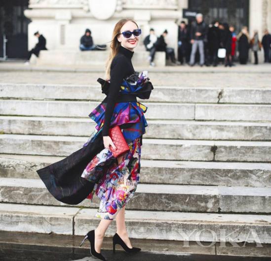 博主Sandra Kleine Staarman身上這件Leonard印花裙,狂放不羈的藝術(shù)筆觸渲染出飽和度極高的抽象印花,搭配濃郁深厚的暗調(diào)上衣與高跟鞋,顯得極為時(shí)髦、高級。不落窠臼的法式優(yōu)雅,散發(fā)著令人陶醉的女人味。比起Sandra波普風(fēng)格的濃艷重彩,同為抽象印花也可穿出淡雅風(fēng)格,博主MarynaKovaltchuk用剪裁精良的Leonard像素印花短外套搭配曳地白色長裙,清新典雅,含蓄端莊,古典精致的造型宣告出街頭的自我個(gè)性。