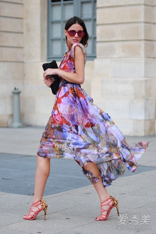 這款雪紡印花裙十分輕盈,飄逸裙擺在夏天的風(fēng)中翩翩起舞,唯美夢(mèng)幻,女人味十足,配紅色綁帶高跟鞋精致又性感。