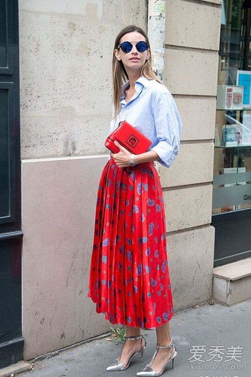 淺藍(lán)襯衫知性又帥氣,配紅色印花百褶長(zhǎng)裙瞬間變得女人味十足,優(yōu)雅精致,帶著復(fù)古氣息。