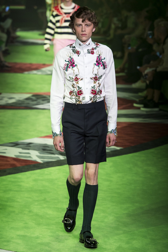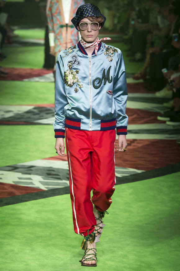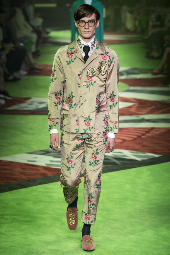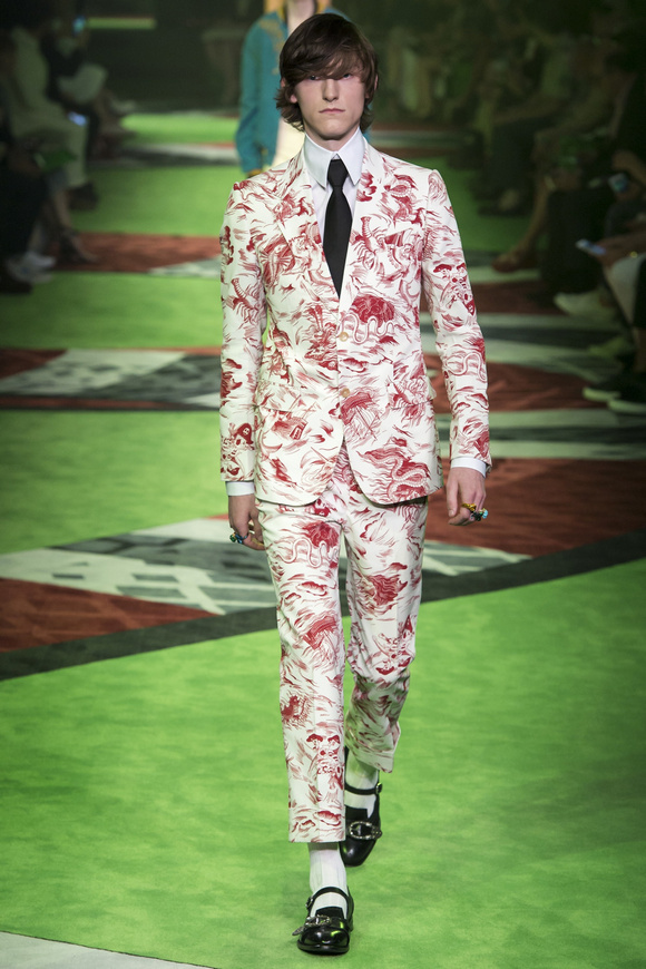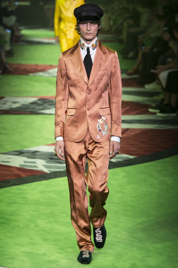 2017春夏的男裝秀場(chǎng)上,GUCCI的秀場(chǎng)上繼續(xù)用極致的顏色充斥整個(gè)秀場(chǎng),上一季運(yùn)用了深紅,更符合秋冬的調(diào)調(diào),而這一季運(yùn)用的深綠更體現(xiàn)春夏的清涼和生機(jī)感。T臺(tái)上蜿蜒流動(dòng)的巨蟒配合深綠的空間猶如營(yíng)造了一個(gè)動(dòng)物森林,空靈而神秘。