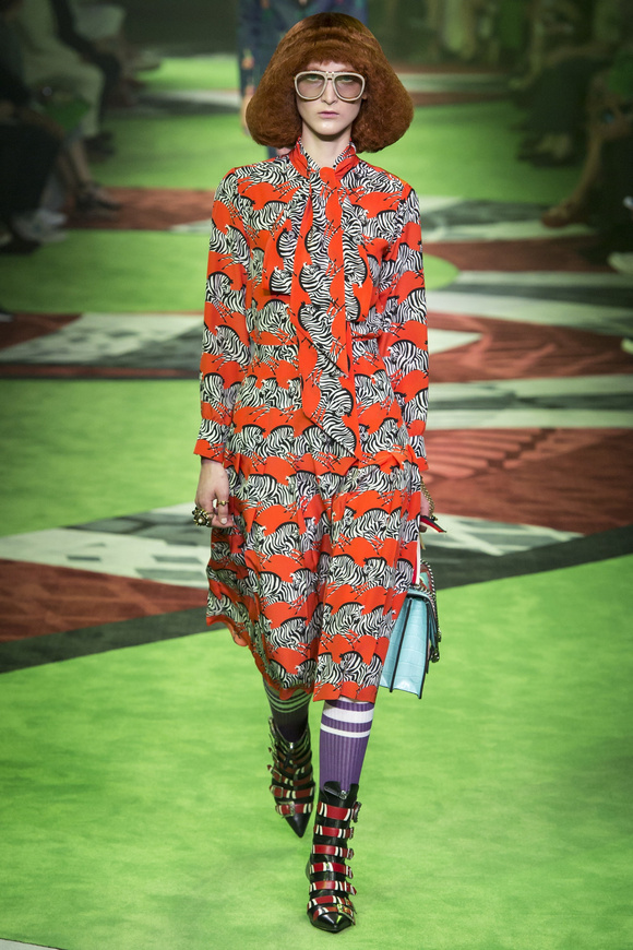 設(shè)計(jì)師Alessandro Michele本次將GUCCI秀場(chǎng)打造成神秘又玄幻的綠色空間,同樣的珍奇異獸、植物印花穿梭于秀場(chǎng)中,猶如處于叢林探險(xiǎn)的境遇一般,設(shè)計(jì)師受多種文化啟發(fā),電影、旅行、動(dòng)漫等等,經(jīng)過加工設(shè)計(jì),和諧地融合在整個(gè)系列中。