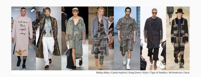 寬松比例與長(zhǎng)袍款式,結(jié)合奢華又復(fù)雜的東方味圖案,為男裝品牌注入獨(dú)特的異國(guó)風(fēng)情。設(shè)計(jì)師利用復(fù)雜密集的花紋為柔和大地色男裝增添奢華感,尤其是令人眼花繚亂的小尺寸重復(fù)印花。例如 Graig Green 全件絲巾印花布局加上綁帶細(xì)節(jié),和 Bobby Abley 中東字體印花的長(zhǎng)袍,呈現(xiàn)反差效果;或是 Casely Hayford 緞面印花,帶出一種貴公子氣息。還有 Sacai 中東風(fēng)情的圖騰印花,Kolor 的手工感 ikat 印染長(zhǎng)袍,也都是一時(shí)之選。
