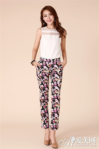 顏色繽紛的印花九分褲,夏日搭配背心非常時尚休閑。推薦純色、雪紡、復古系列的印花背心搭配。