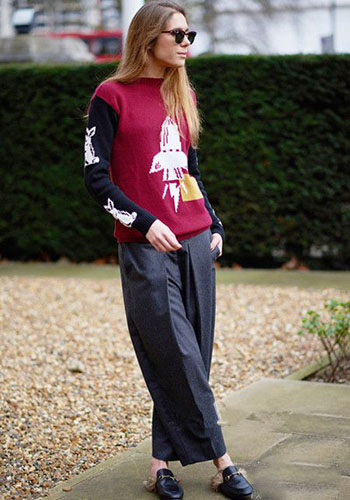 拼色印花毛衣,紅黑顏色,經(jīng)典不敗,搭配寬松九分褲,踩著今年很流行的毛毛平底鞋,吸晴時(shí)髦,讓你溫暖有型。