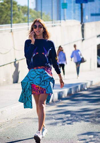 短款設(shè)計(jì)的印花毛衣搭配印花包臀裙,大秀美腿,穿上白色球鞋,更是利落清新,輕松減齡,呈現(xiàn)少女感。