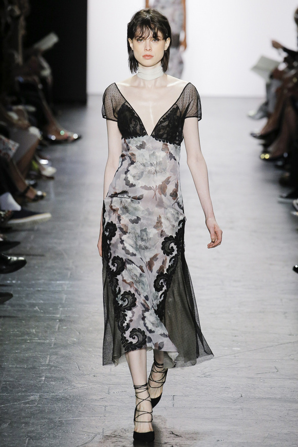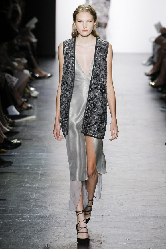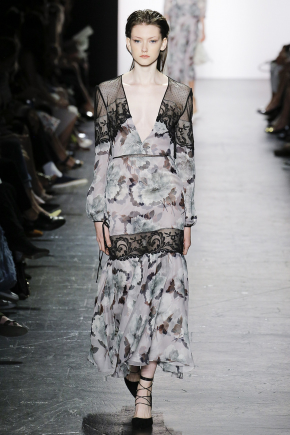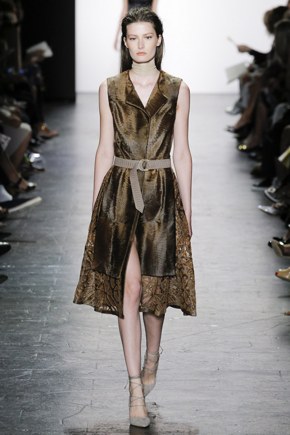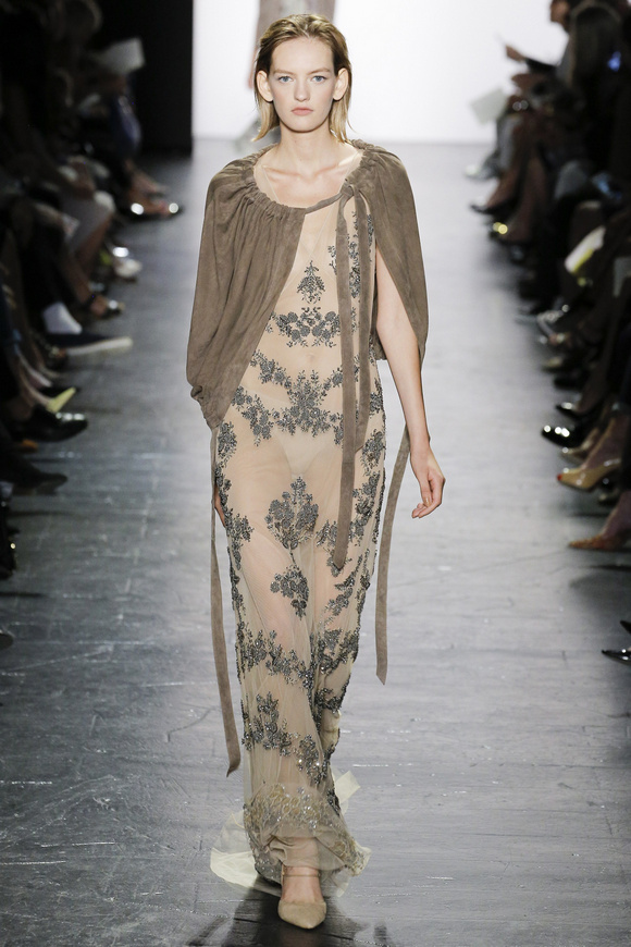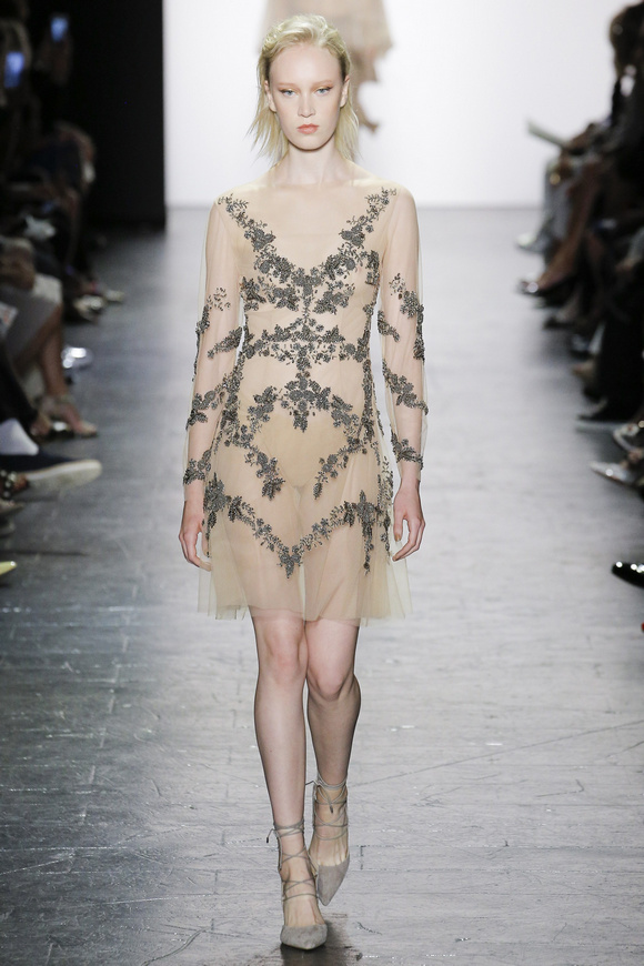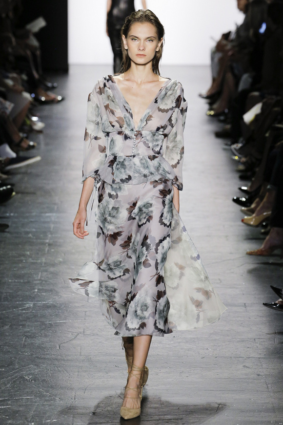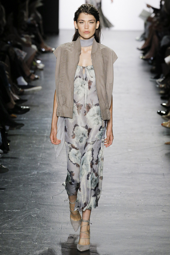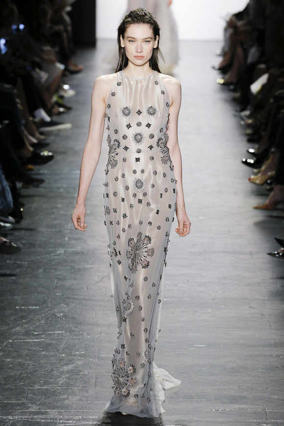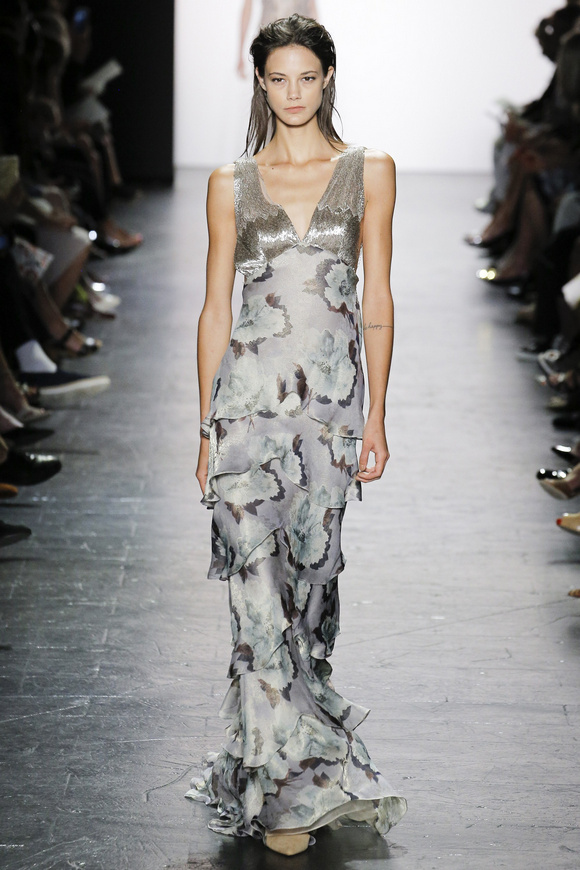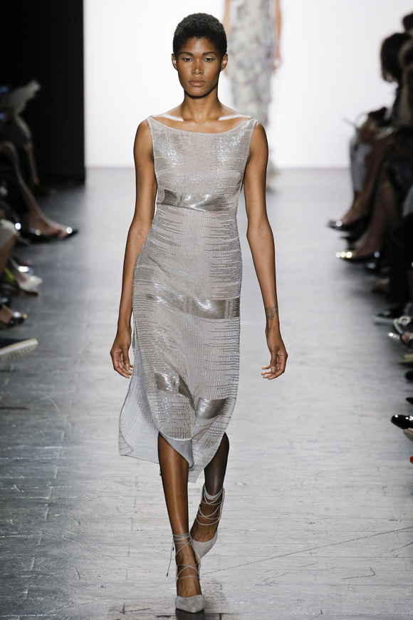 靈感來自ldquo;現(xiàn)代世界rdquo;的思想,ldquo;巴索的春天給人的感覺是一段漫長的旅程后,一種更放松和無憂無慮。禮服讓人想起歐洲舊世界的魅力,中立的鴿灰色、香檳、駱駝、白為主色調(diào),黑色是Dennis Basso一貫的堅持。