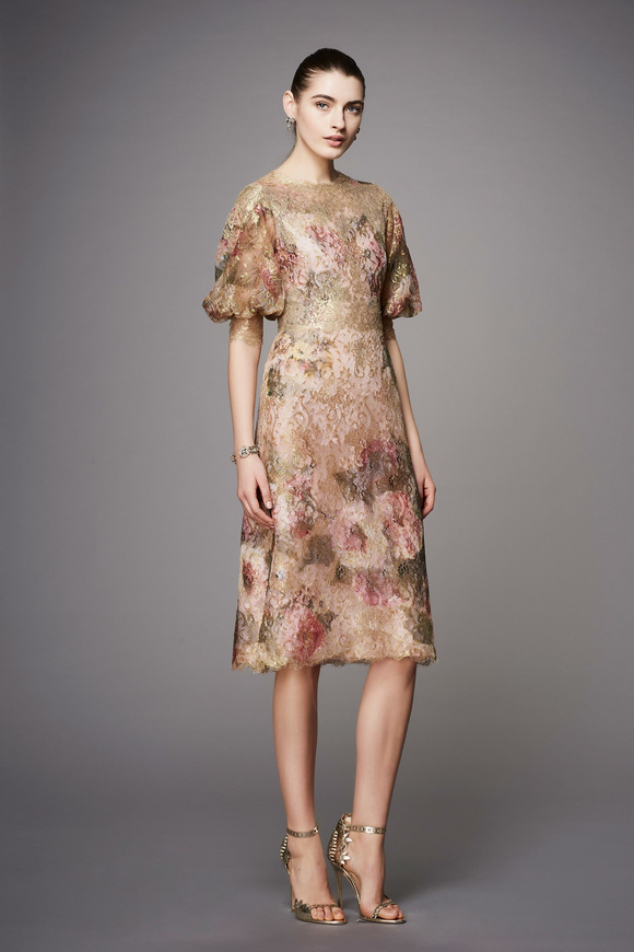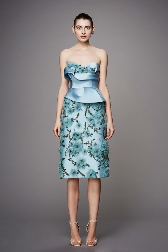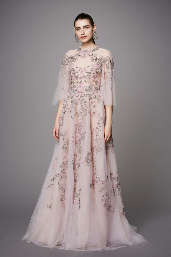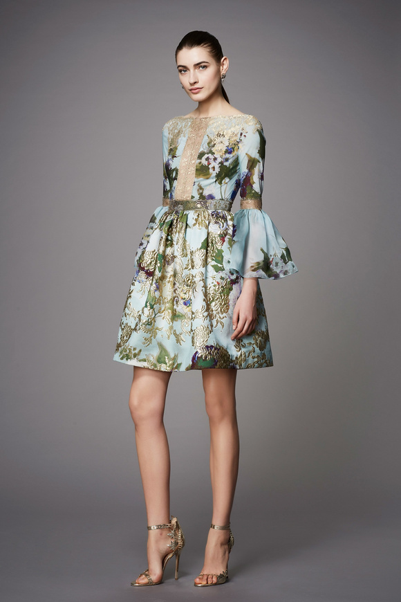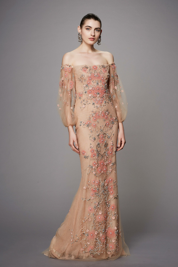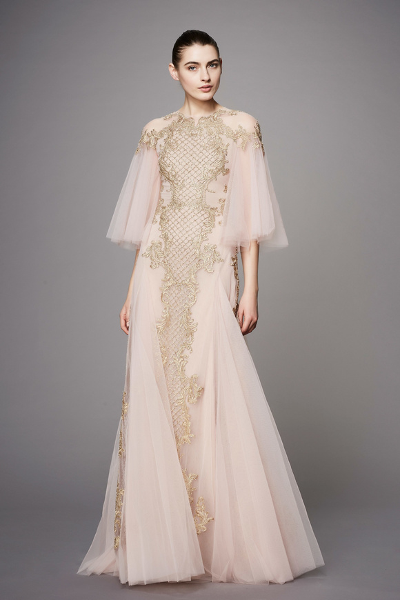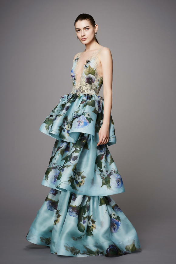 Marchesa 這一季的設(shè)計(jì)運(yùn)用緞面紗、薄紗的褶皺裙、水晶以及金銀制的印花錦緞。