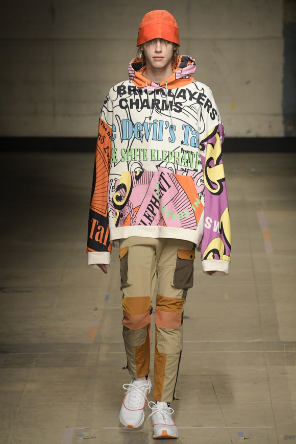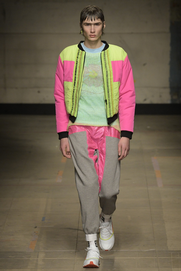 像所有成功的設(shè)計(jì),一些有趣的設(shè)計(jì)后來卻很難完全被清晰地回憶起來,這一季的男裝運(yùn)用的材料跨度很大,形式也很松散。如詩人般的花襯衣,來源于刺青的圖案設(shè)計(jì),污染的灰色的棉軍用夾克。彩色粉筆的長褲,搭配上運(yùn)動鞋,看起來別有一番英倫風(fēng)味。