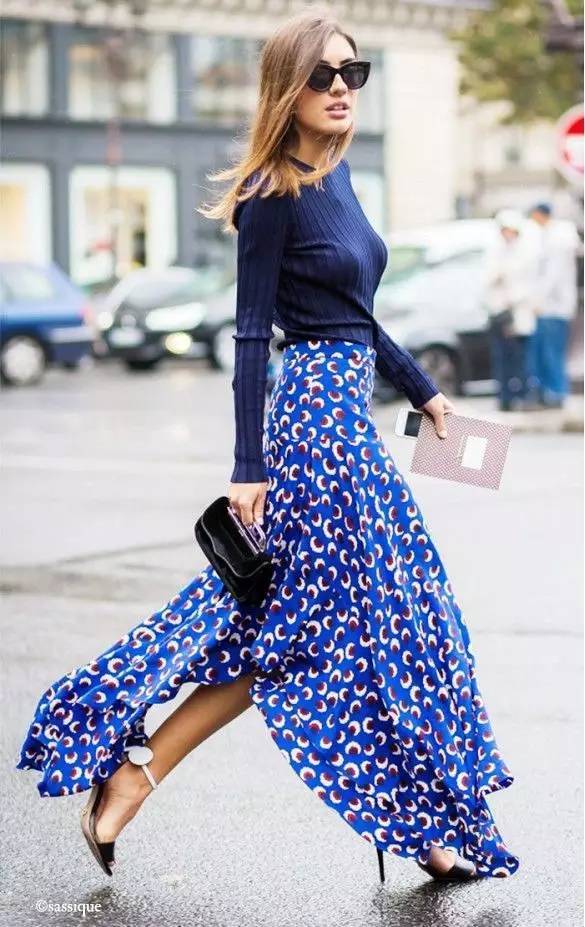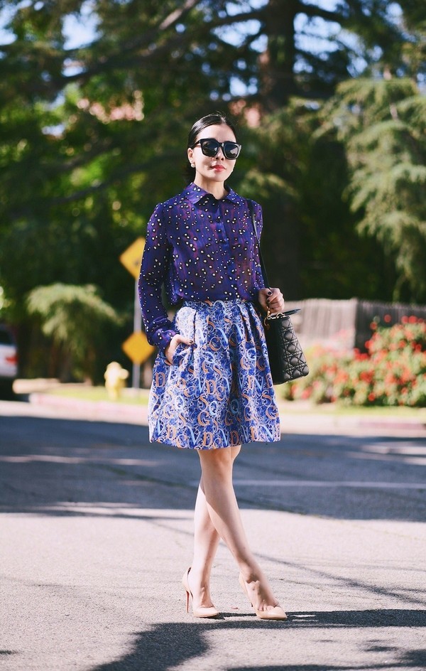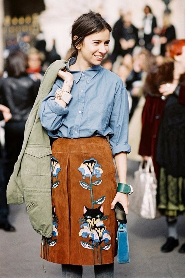 也可以選擇帶有顏色卻足夠清爽的藍襯衫與印花裙作搭配,搭出更出彩的撞色效果。