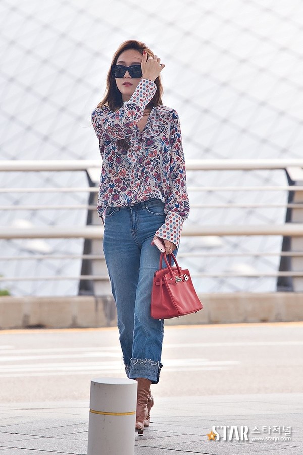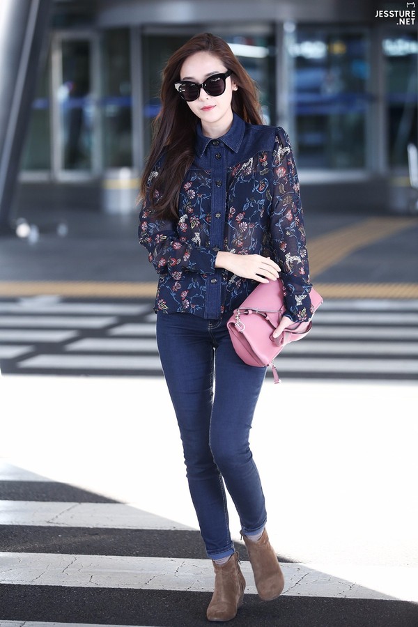 除了選擇萬能基礎色外,也可以在搭配上做減法。印花單品本身就非常搶眼了,所以搭配的其他單品就應該從簡了。像韓國時尚偶像鄭秀妍,就用牛仔褲輕松搭配出了兩套印花襯衫look。
