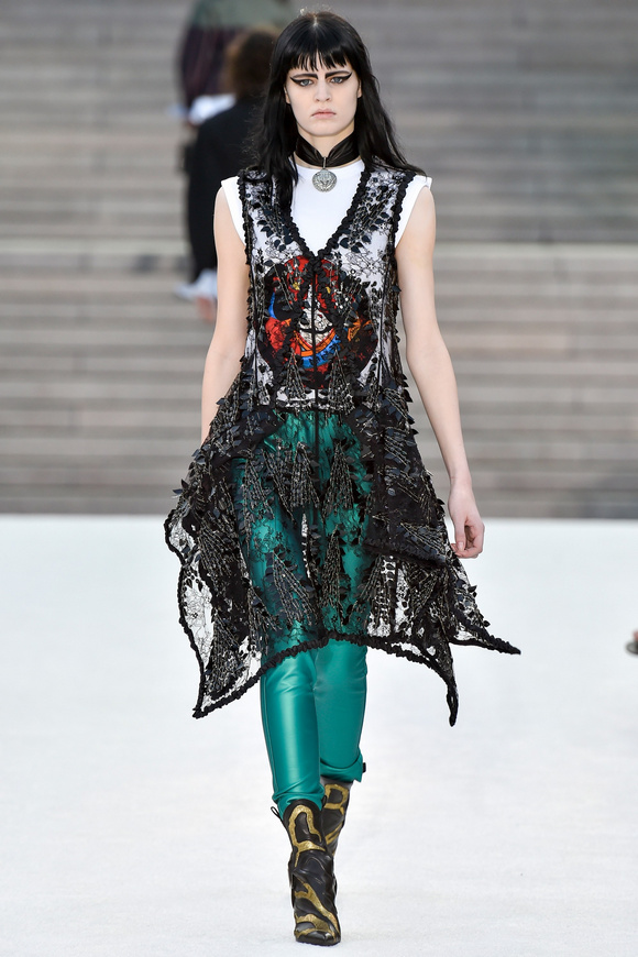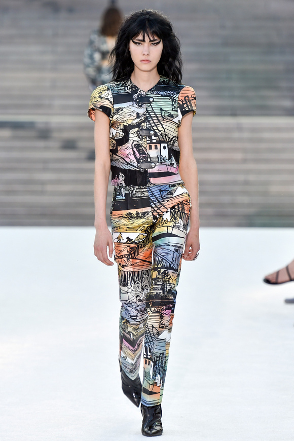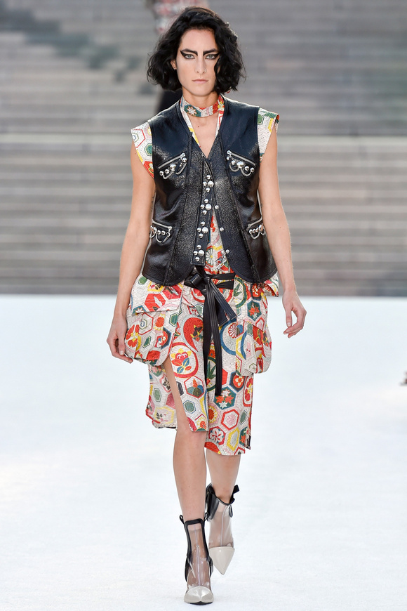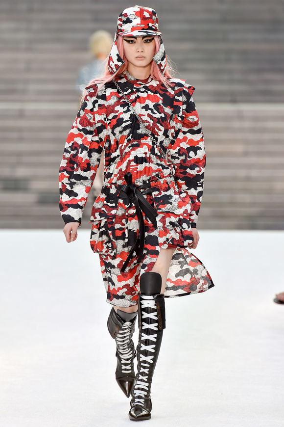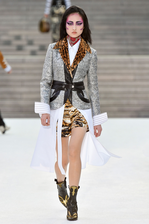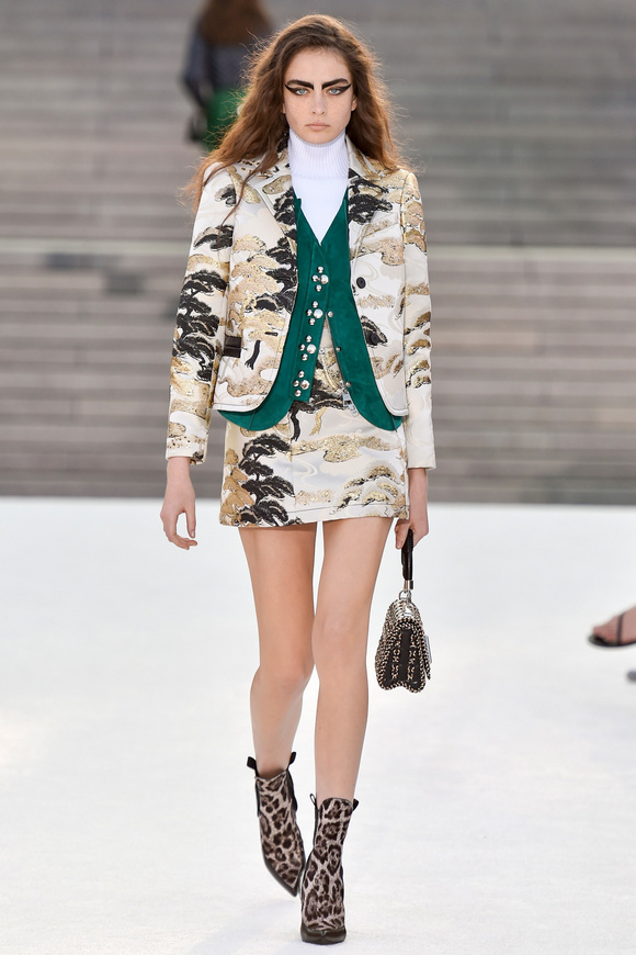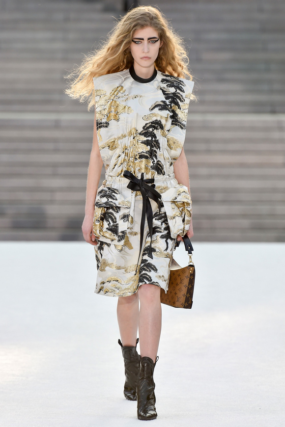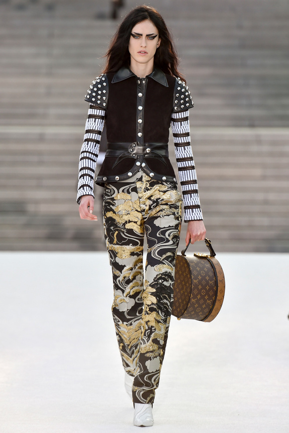 Louis Vuitton 路易斯威登2018休閑時裝這一季的發(fā)布會選在日本的京都舉行,設(shè)計師NNicolas在這里累積了大量的粉絲。這一季的設(shè)計,將日本的武士盔甲、黑澤明的顏色、歌舞伎化妝、傳統(tǒng)版畫的漁民和70年代晦澀的日本電影系列的元素都混雜在一起。